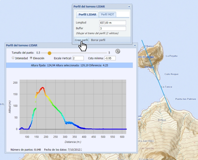 Perfil LIDAR. Para calcular el perfil del terreno según los datos LIDAR, se establecerán dos puntos en el mapa por donde queremos que se calcule el perfil LIDAR. De la misma forma, haciendo clic en el botón Crear perfil, se abrirá una ventana con el cálculo del perfil LIDAR. Tenemos la posibilidad de aumentar o disminuir el parámetro Buffer para obtener una gráfica del perfil con mayor o menor densidad de puntos. Si pasamos el ratón sobre los puntos intermedios del perfil obtendremos información sobre la altitud del punto y su distancia al origen del perfil. Si hacemos clic sobre alguno de esos puntos intermedios se iluminará de forma momentánea en la vista de mapa del visor su ubicación con un marcador azul.